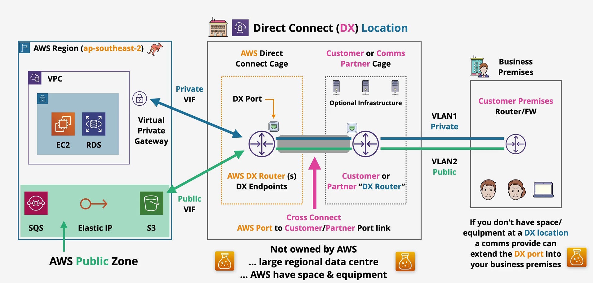 As the architecture diagram illustrates, the Direct Connect location contains two distinct zones: